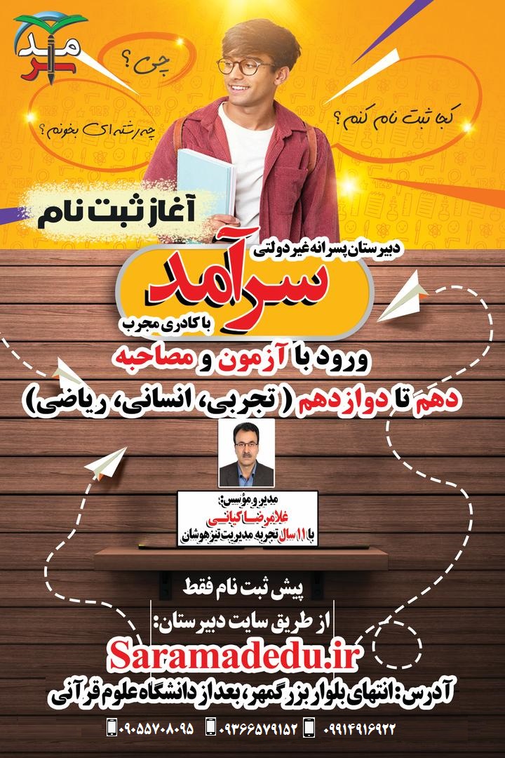 saramadedu.ir دبیرستان سرآمد و همچنین مراجعه حضوری امکان پذیر است. تاریخ آزمون و مصاحبه چند روز دیگر در همین سایت اطلاع رسانی خواهد شد.